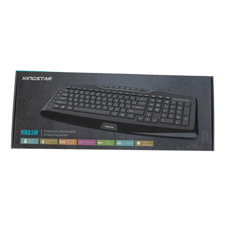 کیبورد کینگ استار مدل kb83w، بدون سیم و نوع اتصال آن دانگل USB (2.4 گیگاهرتز) میباشد. این کیبورد دارای 117 کلید برای انجام فعالیتهای کامپیوتری است. همچنین کیبورد kb83w دارای 12 کلید میانبر به منظور انجام سریعتر کارهاست که عبارتند از Web Home, email, Search, Refresh, Favorite, Music, Play/Pause, Stop, Pre. Track, Next Track, Mute, Volume. همچنین کیبورد کینگ استار مدل kb83w دارای محدوده عملیاتی 10 متر است از دیگر ویژگیهای این کیبورد محصول کمپانی کینگ استار، طراحی کلیدها به گونهای که امکان تایپ کردن در مدت زمانی طولانی را فراهم می کند، دسترسی راحت به تمامی کلیدهای کاربردی، طراحی نرم و سایلنت کلیدها، با دوام و دارای کلید های مات میباشد. امروزه محصول Kb83w کمپانی کینگ استار به دلیل داشتن کلیدهای بی صدا هنگام تایپ توجه بسیاری از کاربران را به خود جلب کرده و همین امر موجب شده تا به یکی از پرفروش ترین محصولات کینگ استار تبدیل شود.